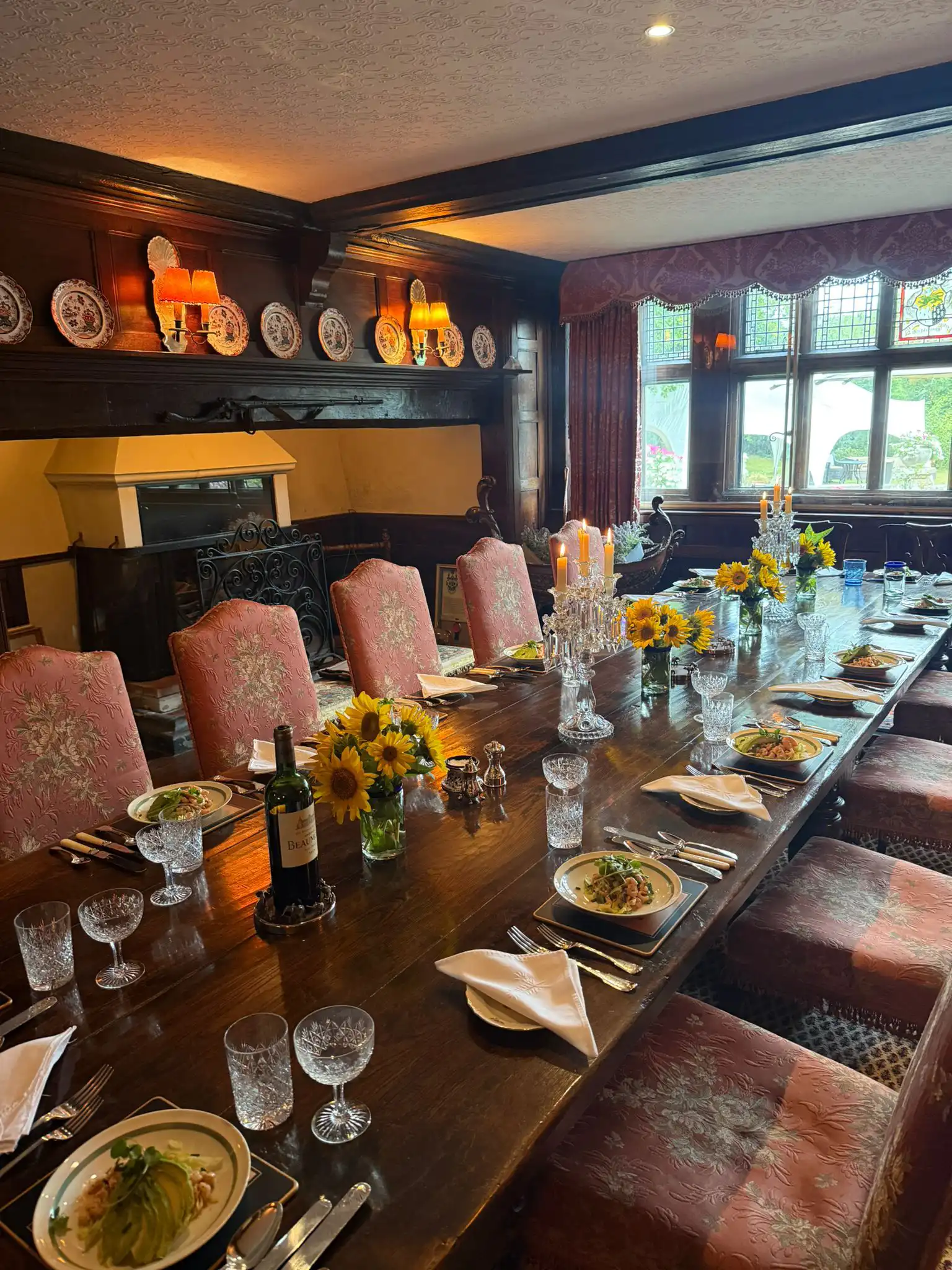 The drawing room, historically known as the “Old Hall,” occupies the northern half of the east wing and incorporates the former entrance porch. Its stone fireplace, with a flat four-centred arch, is complemented by an elaborate imported overmantel featuring carved caryatid figures. Original timber elements survive here, including a beam with finely carved stop-chamfers.