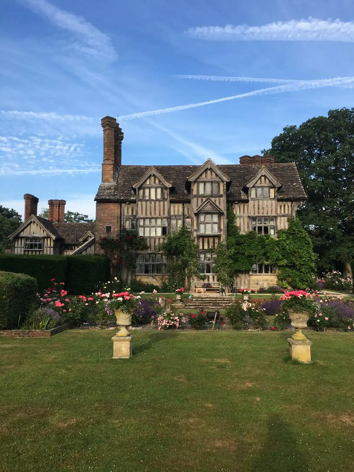Set within extensive grounds, Great Ote Hall is a distinguished two-storey house with attics, embodying the character and craftsmanship of late Tudor and early Jacobean Sussex. Its walls are constructed in traditional half-timbering set upon sandstone plinths, with later brick infill, while the roofs are covered in locally distinctive Horsham stone slates. Five substantial brick chimney stacks rise prominently above the building, reinforcing its historic presence.